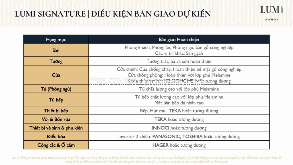 Vật liệu bàn giao căn hộ Lumi Hà Nội
