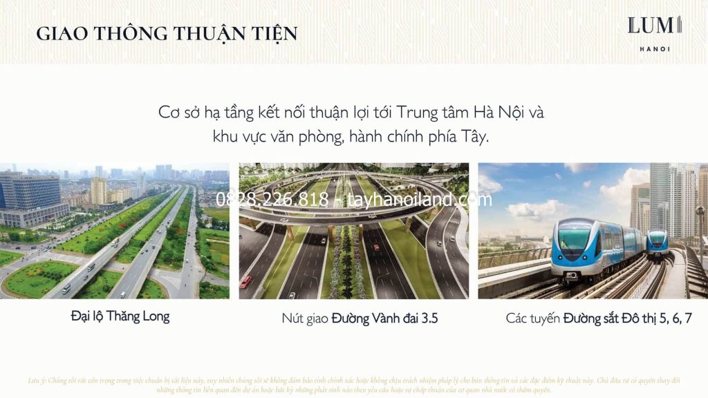 Với việc kết nối trực tiếp với Đại Lộ Thăng Long và vành đai 3.5, Lumi Hà Nội mang lại lợi thế về giao thông, giảm thời gian di chuyển và giải quyết tắc nghẽn giao thông. Chỉ mất 8 phút để đến trung tâm phía Tây Hà Nội, 25 phút đến trung tâm thành phố và 40 phút đến sân bay Nội Bài, Lumi Hanoi hứa hẹn là một địa điểm sống lý tưởng trong khu vực có hạ tầng phát triển và động bộ bậc nhất của thủ đô.
